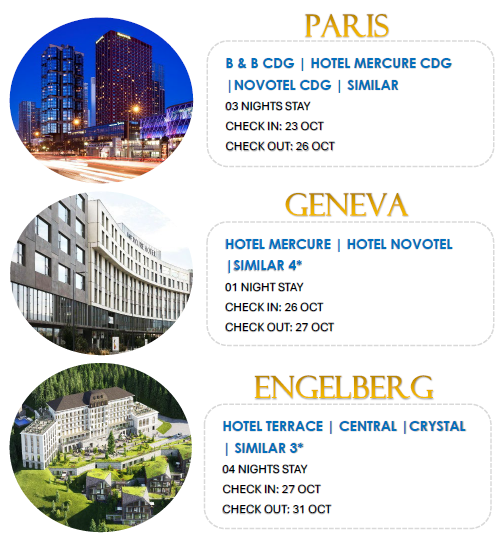 Enjoy Parisian breakfast & check out. Board train and enjoy scenic train journey to Geneva/ Lausanne. The city of Geneva, lies at the southern tip of expansive Lac Léman (Lake Geneva). Surrounded by the Alps and Jura mountains, the city has views of dramatic Mont Blanc. Arrive Geneva and see Headquarters of Europe’s United Nations and the Red Cross, it’s a global hub for diplomacy and banking. Also, you will visit The Jet d'Eau is a large fountain in Geneva, Switzerland and is one of the city's most famous landmarks and The English Garden is one of the most beautiful places to walk by the lake shore, and one of the liveliest parks in Geneva. Later proceed to Montreux for Cruise (aboard a belle epoque boat.). This cruise leaves from Montreux and passes through Vevey, Clarens, Territet, Château de Chillon, Villeneuve, Le Bouveret and St Gingolph before returning to Montreux. You will see statue of Freddie Mercury, was a British singer and songwriter who achieved worldwide fame as the lead vocalist and pianist of the rock band Queen. Regarded as one of the greatest singers in the history of rock music, he was known for his flamboyant stage persona and four-octave vocal range. On the way back visit statue of Charlie Chaplin, Greatest comedian in the World before returning to Geneva. On the promenade, marked by a giant fork protruding from the lake, is the nutrition museum Alimentarium, with culinary objects and workshops. A Charlie Chaplin statue is nearby. This one-time Vevey resident is also celebrated at Chaplin’s World, on his former country estate. for the night, sleep tight for the rest of the night. Dinner at Indian restaurant and stay overnight at Geneva/Lausanne/Montreux.
