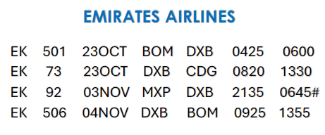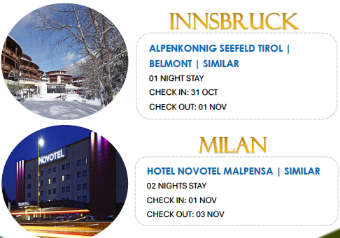 - Return airfare & taxes Ex. Mumbai – Emirates airlines/similar