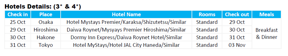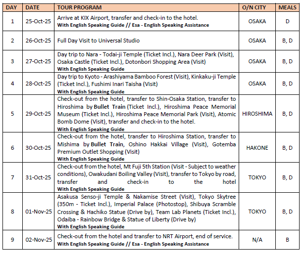 • 08 Breakfast (Japanese/Western) (B), 08 Dinner (D), as per the itinerary.